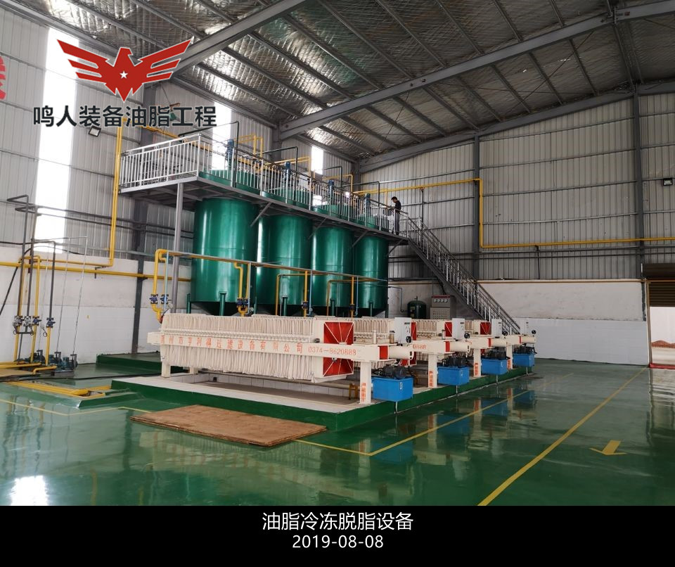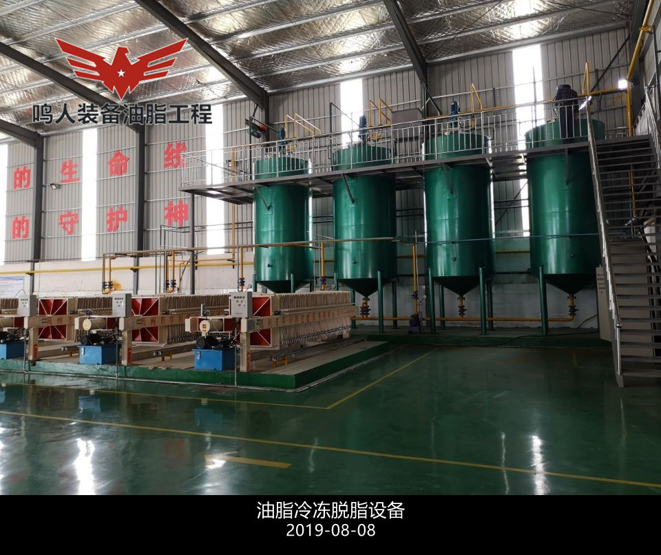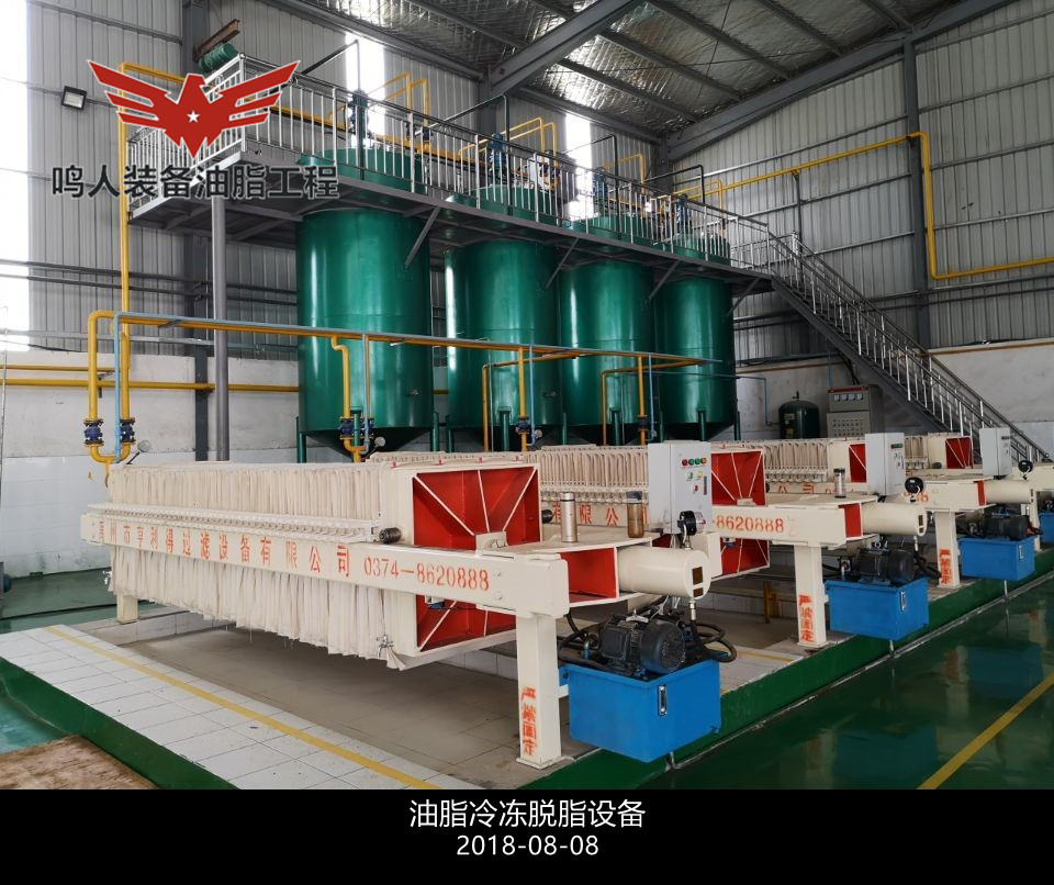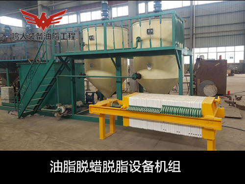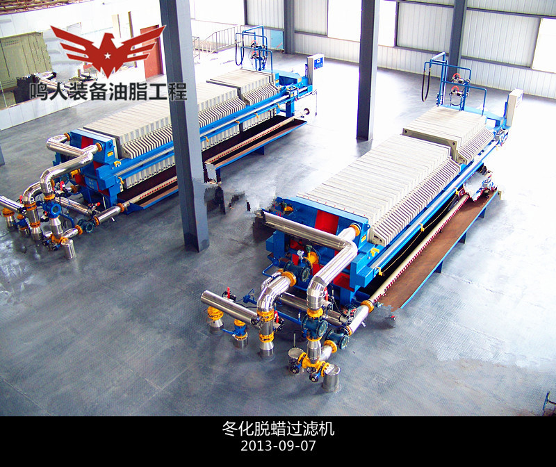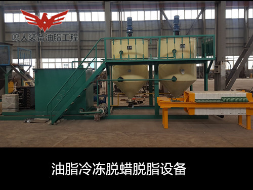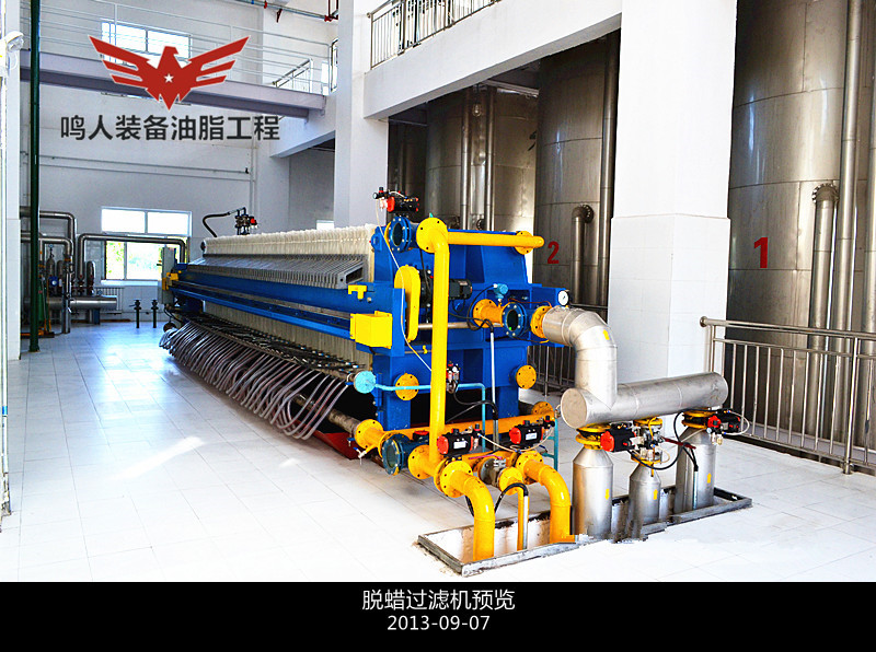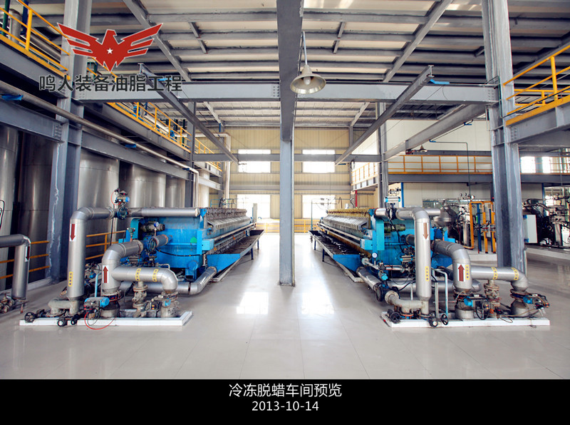 低溫脫蠟即單靠冷凍結晶,然后用機械方法分離油、蠟而不加任何輔助劑和輔助手段的脫蠟方法。分離時采用加壓過濾、真空過濾和離心分離等設備。此法**簡單的是一次結晶、過濾法。將脫臭后的油脂(溫度在 50℃以上)移入有冷卻裝置的結晶養晶罐,慢速攪拌,在常壓下充分冷卻,整個冷卻結晶時間為48h,然后過濾分離油、蠟質。過濾壓強維持在 0.3–0.35MPa,過濾后要及時用壓縮空氣吹出蠟中夾帶的油脂,濾出的油即為脫蠟成品油。